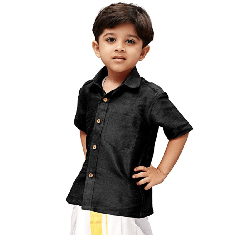 • Its spread collar accentuates its sophisticated charm, while the regular fit highlights its timeless appeal. This ethnic shirt, has a button placket, half sleeves, patch pocket and curved hem. These are perfect accompaniments for a silk dhoti for traditional occasions and also on trousers for a formal, classy look. In souther part of the subcontinent these shirts are widely adorned boys boys and men as a traditional wear for any auspicious occasion.
