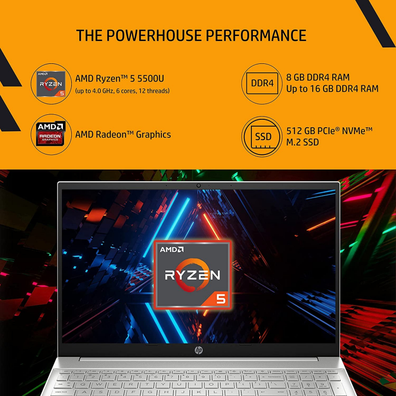 • Processor: AMD Ryzen 5 5500U (up to 4.0 GHz max boost clock, 8 MB L3 cache, 6 cores, 12 threads)